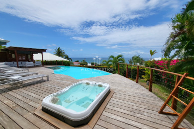 The 170 m² teak deck, designed like a boat deck, overlooks a private tropical garden with no facing neighbours. It includes an outdoor lounge, a shaded gazebo, a jacuzzi, and a salt-treated infinity pool with submerged alarm. From the garden, you can access the coastal path that winds along the sea and connects to several unspoiled beaches, including Helleux Beach and Bois Jolan. Calm and sea views are ever-present.