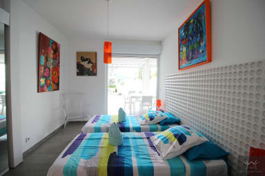 The infinity-edge pool blends seamlessly into the lagoon, inviting you to swim in a truly paradisiacal setting. A tropical garden, outdoor lounge, sun loungers, outdoor shower, gas BBQ, and water sports equipment (kayak, paddle board) ensure plenty of leisure and relaxation. Bicycles are also available for exploring the area. Private parking with electric gate.