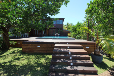 The villa is surrounded by a lush tropical garden with coconut palms, wooden deck, outdoor shower, lounge area, and sun loungers. The saltwater infinity pool overlooks the Basse-Terre mountains. Included activities: paddleboarding, kayaking, and snorkeling. A small motorboat is provided for short transfers from the mainland dock (3-minute crossing).