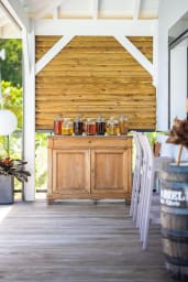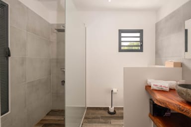 The villa’s terrace opens onto a tropical garden filled with fruit trees and offers unobstructed views of the sea and islands. A saltwater infinity pool (4 m x 8 m), a cumaru wood deck, an outdoor shower, a plancha grill, and a pétanque court await for relaxed island living in total privacy.