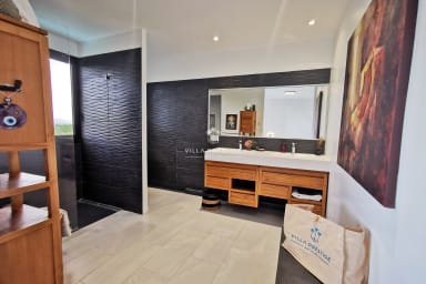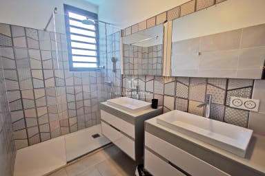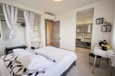 From the terrace, enjoy a chlorine-treated pool with sea view, an outdoor shower, lounge area, plancha, gas BBQ, and sun loungers. Below, a large garden is perfect for children to play. Sports gear, ping-pong table, and snorkeling equipment (fins/masks/snorkels) are also available. Private parking with electric gate.