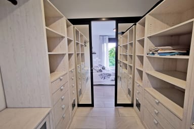 The villa includes 4 air-conditioned bedrooms spread over two levels. The living spaces are on the main level; Bedrooms 1 to 3 are located on the upper floor, and the independent studio is on the lower garden level: