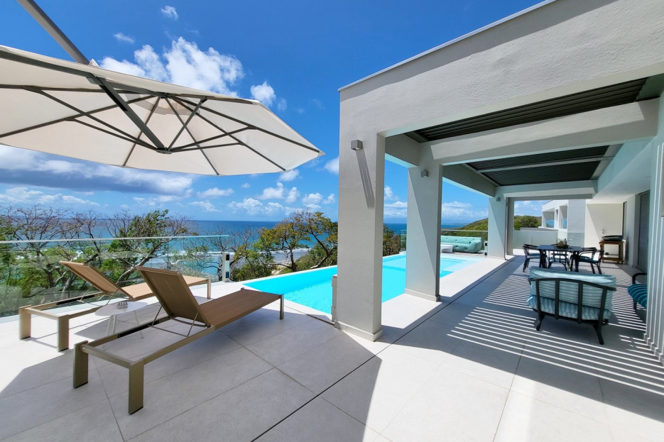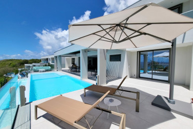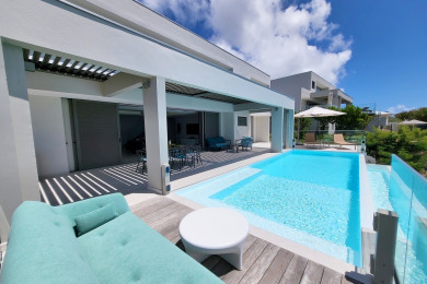 Located in a high-end secured residence along the Route Touristique of Saint-François, this contemporary villa combines comfort with a spectacular setting.
