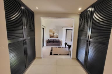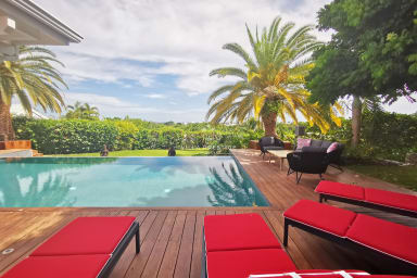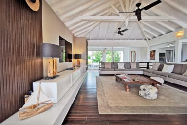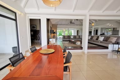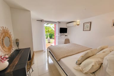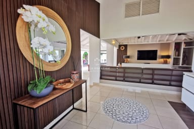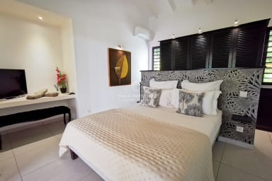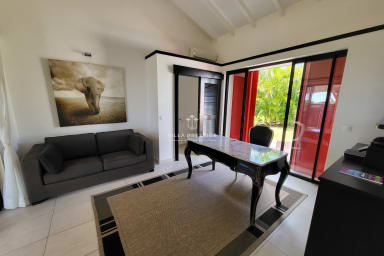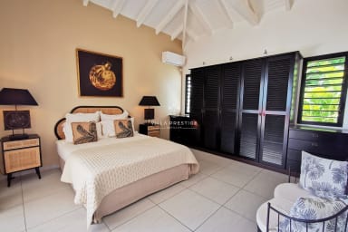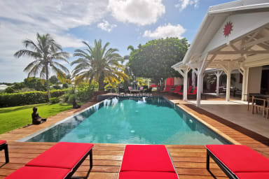 Nestled in a lush green setting just minutes from the heart of Saint-François, Villa Soleil Rouge embodies the art of tropical living. From the moment you arrive, the serene atmosphere and elegant lines of this architect-designed home invite you to unwind. With its panoramic terrace, infinity pool overlooking the horizon, zen basin, and multiple lounge areas, everyone will find their own peaceful retreat. A rare gem for a luxurious holiday with family or friends.