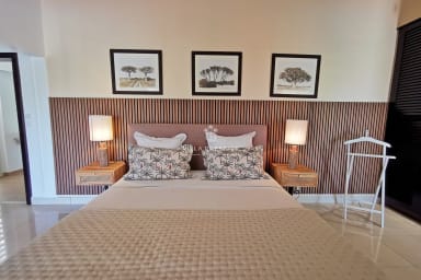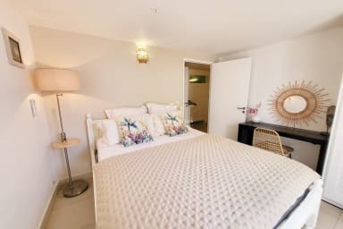 Spacious and filled with natural light, the villa is built around a large through-living room, open on one side to the pool with distant sea views, and on the other to a zen basin surrounded by greenery. The modern, open-plan kitchen is both convivial and functional, allowing you to enjoy the home’s atmosphere while preparing meals. Outdoors, you’ll find sun loungers, cozy lounge areas, a shaded dining space, and a plancha for seamless indoor-outdoor living.