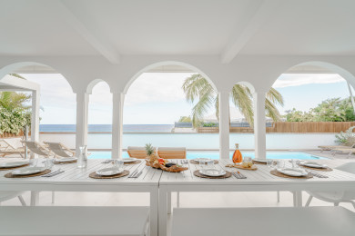 The villa features multiple communal areas: three fully equipped modern kitchens, two indoor lounges (one air-conditioned with sea view), two dining areas, and a stylish outdoor lounge perfect for enjoying the Caribbean breeze. Two terraces — one with sea view and one overlooking the garden — offer plenty of space to unwind. A fitness room with shower is also available. The villa is equipped with Wi-Fi.