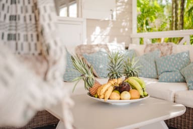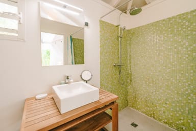 At the heart of the villa, the main living room with sofa and TV opens onto a sea-view terrace. The fully equipped kitchen is perfect for preparing meals in a friendly atmosphere. Several cozy spaces invite relaxation: a lounge under the terrace, a second lounge for sunset drinks, and a carbet with hammocks. A laundry area with washing machine, iron, and linens is available.