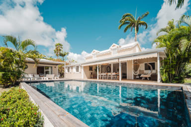 Located in the peaceful and sought-after Helleux neighborhood, halfway between Sainte-Anne and Saint-François, Villa Désir des Îles offers a privileged setting just 5 minutes’ walk from Pierre & Vacances beach and the popular Gros Sable surf spot. Spacious, warm, and tastefully decorated, the villa can accommodate up to 12 guests in a tropical setting surrounded by sea views, meadows, and lush gardens.