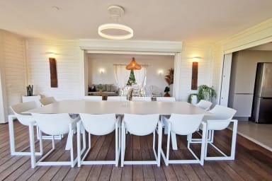 The main level of the villa features a bright through-living room extended by two large terraces. The rear terrace includes a covered dining area with a barbecue for 6 guests. The second, facing the sea, spans 70 m² and includes a large corner sofa, a dining table for 12 guests, and a daybed perfect for lounging. The open-plan kitchen with central island is connected to the living space. On the lower level, a large outdoor lounge area with ambient lighting completes the layout.