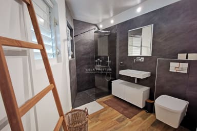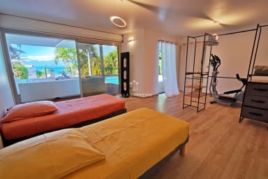 The villa features three large terraces across different levels, including a 70 m² panoramic terrace facing the sea. You’ll enjoy an outdoor lounge, sun loungers, outdoor shower, barbecue and plancha grill. The saltwater mirror pool, secured by an immersed alarm, also includes a bac à punch – perfect for relaxing with an ocean view. The house is equipped with two municipal water tanks (total 2,000 L), fitness equipment, and an electric gate.