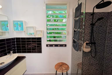The dining area is set under a covered carbet, allowing you to enjoy outdoor meals even during a tropical shower. A cozy indoor lounge with a comfortable sofa and television is also available for relaxing breaks.