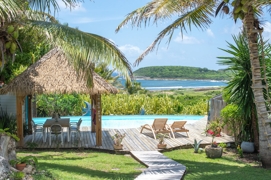 A large saltwater pool (10 x 5 m) awaits, surrounded by sun loungers and a shaded lounge area under a traditional carbet.