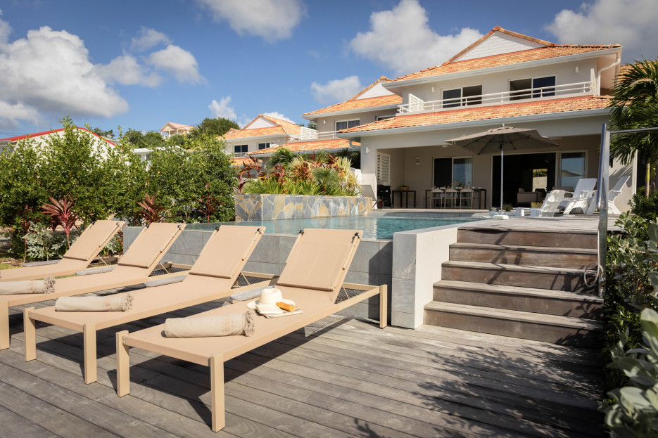 Surrounded by lush tropical plants, the exotic wood terrace offers a breathtaking view of the sea and Le Diamant Rock.