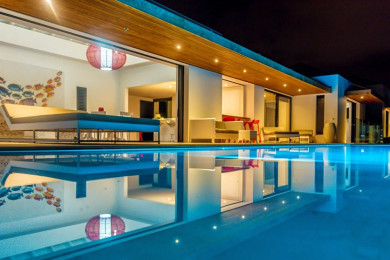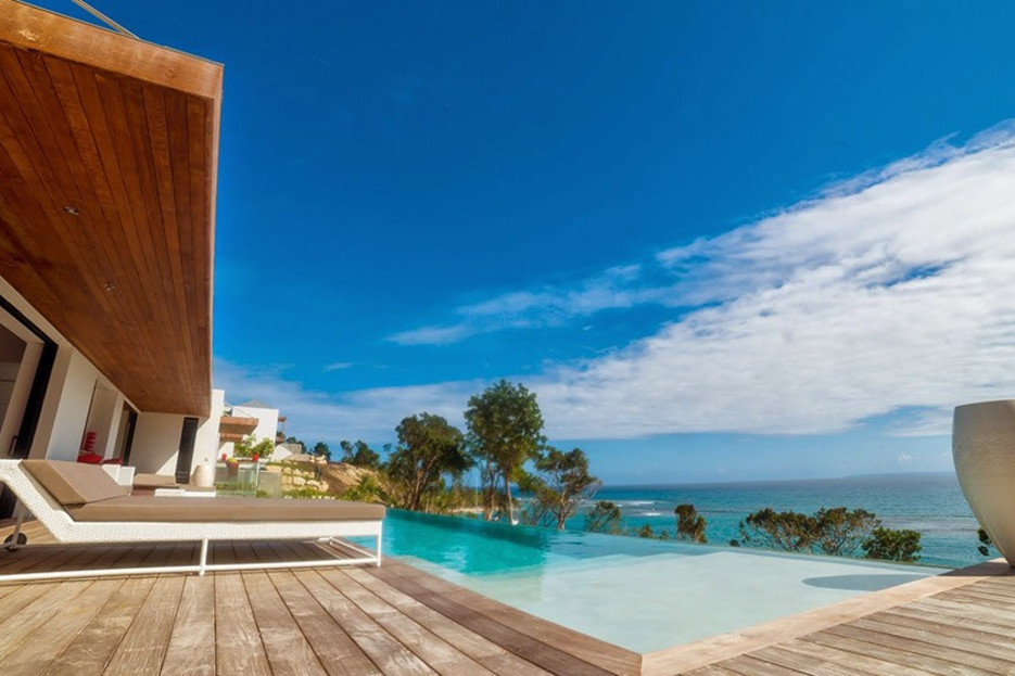 The villa opens onto a beautiful wooden deck with sun loungers and an infinity pool overlooking the ocean. Between sky and sea, the serene atmosphere invites you to relax in the heart of nature.