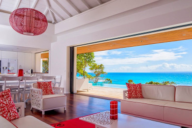 Bright and open to the sea, the main living area combines elegance and comfort. The cozy lounge, fully equipped kitchen, and dining area come together in a chic, refined setting with bold red accents.