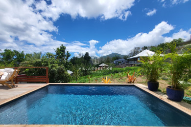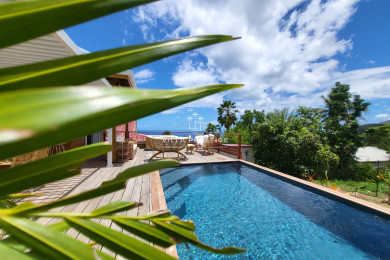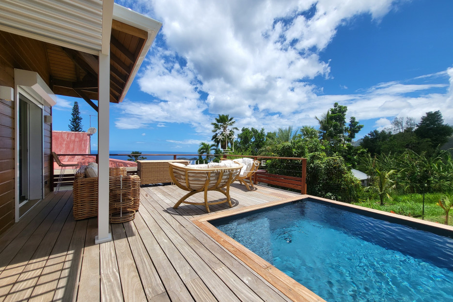 The wooden terrace offers panoramic views of the sea and the Pigeon Islets. It features a large dining table, a comfortable outdoor lounge, and a private pool surrounded by a relaxation area. You’ll enjoy a prime spot to admire Caribbean sunsets over the sea.