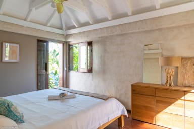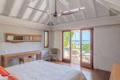 The villa offers three air-conditioned bedrooms, each with a king-size bed, en-suite bathroom, and beautiful views of the ocean or surrounding tropical greenery. Two of the bedrooms are located in the same bungalow, while the third is fully independent, accessible by a few steps—offering total privacy.