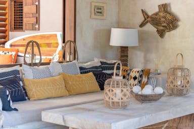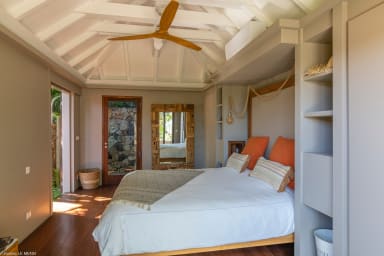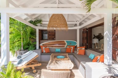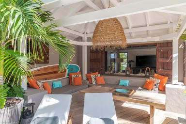 The main living space of Villa Ti Rock offers stunning views over the lagoon. Warmly decorated in a typical Caribbean style with light wood accents, the space features a comfortable TV lounge with a plush sofa and lots of cozy cushions. The dining area, set in the same open-plan space, includes a lovely table for six guests. The fully equipped kitchen is housed in a separate bungalow for added charm and functionality.