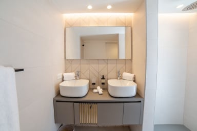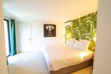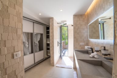 To reach the three main bedrooms, simply cross a charming outdoor patio. These rooms are modern, each equipped with a television. The master suite features a spacious walk-in closet and a private terrace overlooking the garden. On the lower level, you’ll find a fully independent fourth bedroom—more of a self-contained studio—with its own equipped kitchen and lounge area, opening directly onto the garden and offering ultimate privacy and comfort.