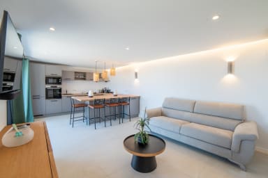 The air-conditioned living room features large glass doors that flood the space with natural light, highlighting the spacious sofa and HD television. Beneath the high, pristine ceiling, the atmosphere is calm and relaxing, with soothing views of Gustavia and the azure ocean beyond. In the same open space, the modern, fully equipped kitchen includes a cozy dining area—perfect for sharing meals with family or friends.