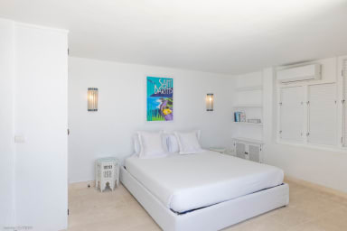 Spread across four levels, the villa accommodates up to eight guests in four independent pavilions, each accessible via exterior staircases. Every bedroom is air-conditioned and features an en-suite bathroom. Three rooms have king-size beds, and the fourth offers twin beds. All bedrooms enjoy a sea view.