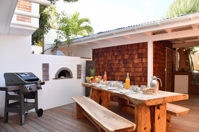 Outside, Villa Moonlight unfolds into a true tropical haven: majestic palm trees, flowering shrubs, and wooden walkways enhance the exotic charm of the setting. The shimmering pool and jacuzzi promise pure relaxation, while the wood-fired oven and barbecue set the scene for delightful, convivial evenings.
