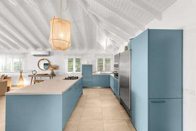 Comprising a main building and an independent bungalow, Villa Essenia is fully air-conditioned. The bright living room opens generously onto the outdoors and offers breathtaking views. Natural materials, light wood, and soft fabrics create a warm and modern ambiance. The fully equipped open-plan kitchen flows naturally into the living room and out to the terrace. Beneath the high ceilings, the trade winds circulate freely — unless you prefer the comfort of air conditioning for your relaxing moments.