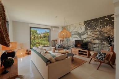 The villa offers a spacious and bright living area, enhanced by large sliding glass doors that open onto the garden and the pool. The air-conditioned living room is furnished with a comfortable sofa, a flat-screen TV, and tasteful natural-inspired décor, creating a warm and relaxing ambiance.
