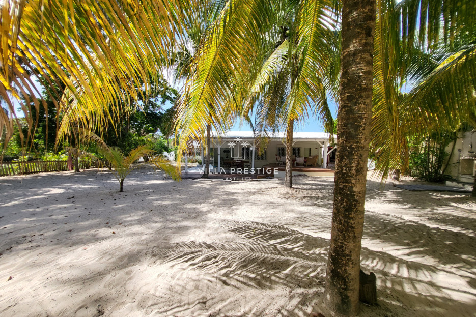 The sandy garden, dotted with coconut trees, leads directly to the sea. The covered terrace offers several relaxing areas: outdoor dining, lounge space, and sun loungers. A truly unique setting, where you can enjoy barefoot living in the heart of Saint-François.