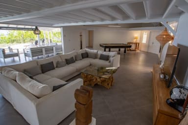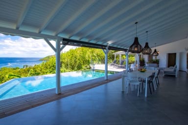 The living room opens onto a large wooden terrace surrounding a magnificent infinity mirror pool and a jacuzzi, with spectacular views of the Caribbean Sea.