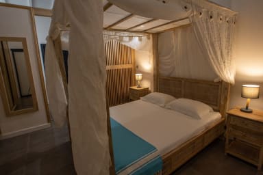 The villa features 4 air-conditioned bedrooms, each equipped with mosquito nets: