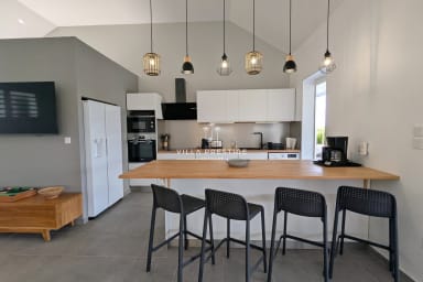 All on one level, the villa features a spacious contemporary living room furnished with a large corner sofa, a television, and wide openings onto the terrace. The modern, fully equipped kitchen is open to both the living room and the outdoors. Meals are enjoyed at the large table under the covered terrace, perfect for making the most of the tropical climate.