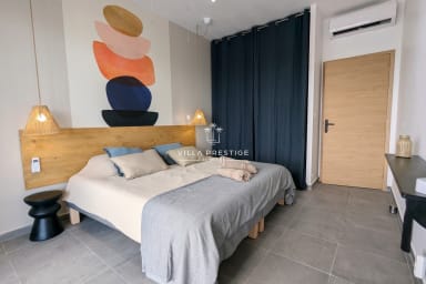 The covered terrace brings together an al fresco dining area and an outdoor lounge for relaxing at any time of the day. The private pool, surrounded by sun loungers and Fatboy chairs, invites you to enjoy the sunshine while taking in a partial sea view.