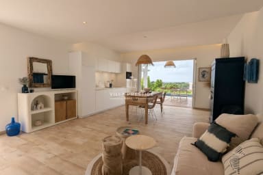Each villa also has its own independent living space, designed in the same light and contemporary spirit. The living room opens onto a private terrace, with a modern integrated kitchen and a convivial dining area.