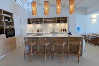 On the ground floor, the villa opens onto a bright and welcoming living area: a fully equipped kitchen with central island, a spacious lounge with comfortable sofas and TV corner, a second outdoor lounge, a bar area, and a large dining table — all designed for moments of sharing and relaxation.