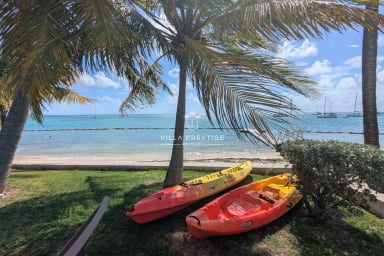 The 100 m² deck terrace, oriented towards the horizon, hosts a private saltwater pool and generous areas for dining or relaxing by the lagoon. A barbecue corner, a covered outdoor lounge and a lush garden extend this invitation to unwind. Two outdoor showers provide the perfect refreshment after a swim or a day at the beach. From the private dock, kayaks and paddleboards are available to explore the turquoise waters at your own pace, while direct beach access offers the freedom to enjoy the sea at any time of day.