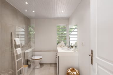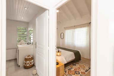 The villa features two master bedrooms, each adorned with an ensuite bathroom. The first master bedroom resides within the main house, seamlessly blending modern elegance with tropical charm. Here, large windows frame panoramic views of the lush surroundings, inviting in the warm Caribbean sunlight. The ensuite bathroom boasts contemporary amenities, offering a private oasis for relaxation.