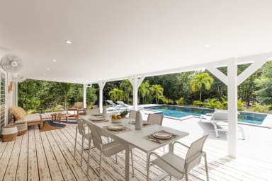 The villa's interior spaces are thoughtfully designed, with an open-concept layout that seamlessly connects the living, dining, and kitchen areas. The decor exudes a sophisticated tropical aesthetic, combining neutral tones with vibrant pops of Caribbean-inspired colors. High ceilings and large windows enhance the sense of spaciousness, creating an airy ambiance that complements the tropical surroundings.