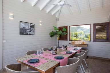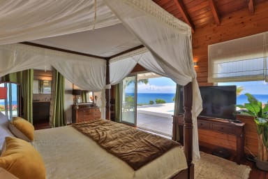 The spacious terrace, adorned with palm trees and tropical flowers, features two heated pools and a bubble bath, offering a perfect oasis for ultimate relaxation. Three of the bedrooms offer stunning views of the Caribbean Sea and direct access to the pool terrace, allowing you to take in the beauty of the surroundings at any time. The fifth bedroom, located below the house and accessible by a path around the house, offers additional privacy for a peaceful stay. This unique room will allow you to fully enjoy your getaway with its breathtaking sea view and small private terrace, ideal for moments of relaxation and contemplation.