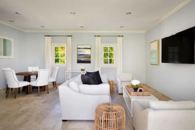 The estate features six bedrooms, providing ample space for a large group or multiple families. In addition to the bedrooms, there is a media room, a living room, a dining room, a fully equipped kitchen, and even a ping pong table and kayaks for beachside enjoyment.