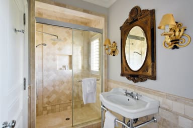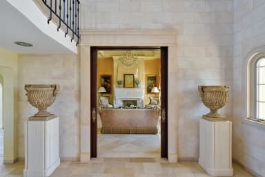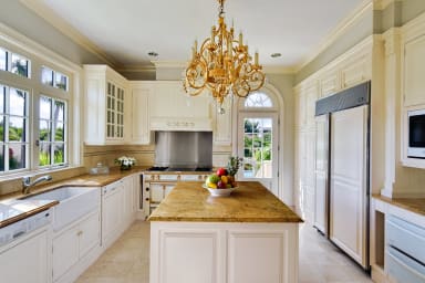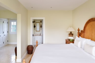 On the garden side of the estate, you'll find four additional bedrooms, a chef's kitchen, a tennis court and a gym. These facilities ensure that guests have access to a wide range of amenities for both relaxation and recreation.