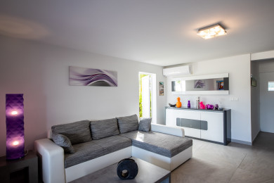 The interior is bright and welcoming, with an air-conditioned living area, an open-plan kitchen, and a glass door leading to the terrace overlooking the sea. The ambiance is calm, stylish, and ideal for relaxing.