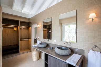 The villa’s beautiful outdoor spaces open to a free-form infinity pool, a large open deck with plenty of room for poolside sunbathing, and a gazebo with a sitting area to enjoy the cool island breeze and views of our smaller neighboring islands, Green Cay, Pinel and Tintamarre.