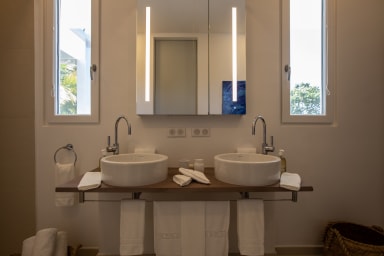 For those seeking added privacy, the fifth bedroom is located in a separate bungalow. This charming space includes an en-suite bathroom, a fully equipped kitchen, and a small private terrace, ensuring a tranquil and exclusive stay.