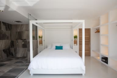 Two bedrooms, equipped with air conditioning, king-size beds, en-suite bathrooms, and outdoor showers, are connected to the main living area. These bedrooms offer a tranquil and comfortable retreat.