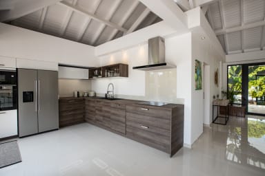 Villa Nuit d'Étoiles is a stunning two-bedroom property that has recently been renovated and is located in Terres Basses in Saint Martin. This villa provides all the comfort and privacy you need for a wonderful stay. The cozy interior living space features a lounge area with a large corner sofa and a television, as well as a small dining area that opens up to the open-plan kitchen.