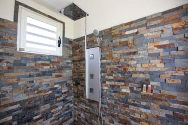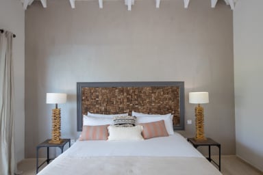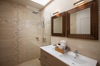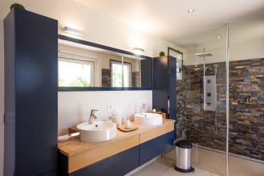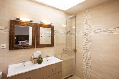 The four bedrooms are of equal size, one of which has an outdoor shower on its private terrace. Two bedrooms are accessible from the inside and offer a view of the garden. From the living room, a few steps provide access from the outside to the other two bedrooms, located on the lower pool level.