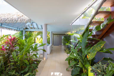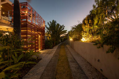 The tropical garden surrounding the house and deck adds to the enchanting atmosphere, creating a serene and peaceful ambiance that's perfect for relaxation and rejuvenation. The lush greenery and colorful flora are likely to attract an array of tropical birds and other wildlife, creating a natural symphony of sounds that soothe the senses.