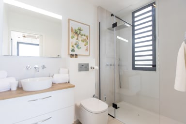 Inside the villa, you'll discover 4 beautifully decorated bedrooms, accessible from the interior space. Each bedroom is fully air-conditioned and has an en-suite bathroom, guaranteeing privacy and comfort. Three of them offer panoramic views of the pool and ocean. The fourth bedroom overlooks the garden and has its own private terrace where you can retreat to enjoy a moment of tranquility.