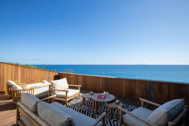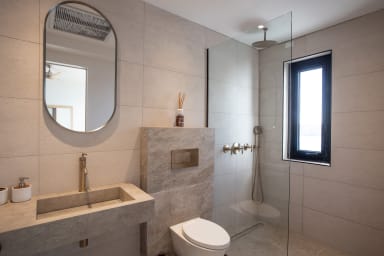 Villa Aqua Vista features six opulent bedrooms, each meticulously designed to deliver supreme comfort and tranquility. The master suite exudes serenity an en-suite bathroom and panoramic sea vistas. The other bedrooms are equally inviting, offering plush furnishings, en-suite bathrooms. Four of the bedrooms are on the ground floor, while the fifth is on the lower level adjacent to the living areas. The sixth bedroom is located on the second lower level and is accessed by an outside staircase, offering a panoramic view of the Caribbean Sea from the bed.